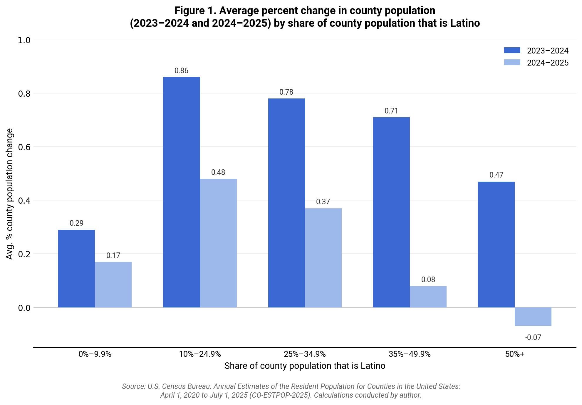Generally, the greatest population slowdown occurred among counties with higher percentages of Latino residents. Figure 1 shows the average percent change in population between 2023-2024 and 2024-2025 across five categories, based on the percentage of the county population that is Latino. All five categories experienced slower growth rates in 2024-2025 than in the previous year. However, the relative drops were greatest in counties with 35 percent or more of the population being Latino. In counties where 35.0 to 49.9 percent of the population is Latino, the average 2024-2025 growth rate was slightly more than one-tenth of the average 2023-2024 growth rate. Furthermore, in Latino-majority counties (those where Latinos account for 50% or more of the county population), the average 2024-2025 growth rate was slightly negative at -0.07 percent compared to a 0.47 growth rate a year earlier.