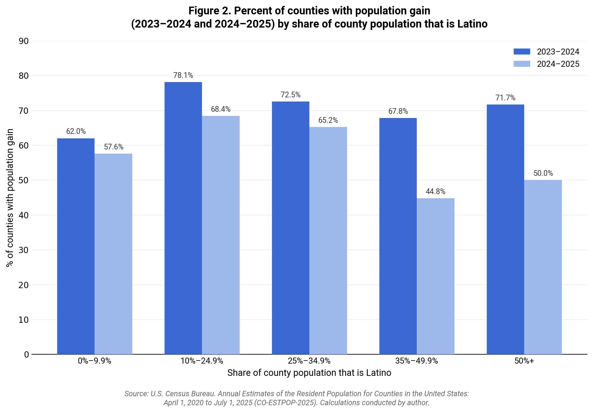 Overall, the percentage of counties experiencing population growth declined over the last two years, from 65.8 percent in 2023-2024 to 59.3 percent in 2024-2025. However, the decline was greatest in counties where Latinos make up 35 percent or more of the total population (Figure 2). Indeed, the percentage of counties with population increases dropped by 23 and by 21.7 percentage points among counties with 35.0-49.9 percent Latinos and among those with 50 percent or higher Latinos, respectively. The percentage declines were much smaller in counties where fewer than 35 percent of their populations were Latino, especially among those with less than 10 percent who were Latino, with a drop of 4.4 percentage points.